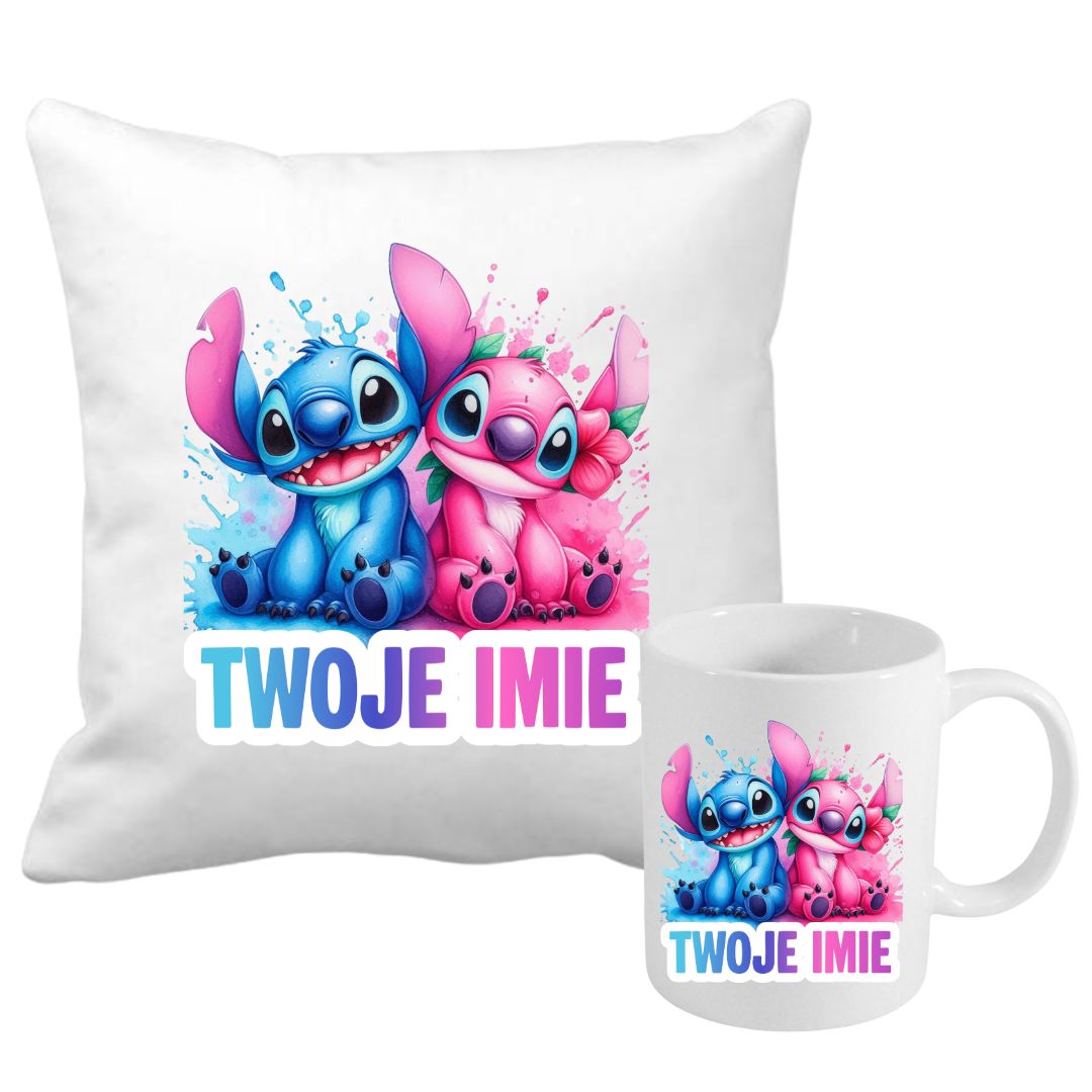 Zestaw poduszka i kubek STITCH i ANGEL z imieniem